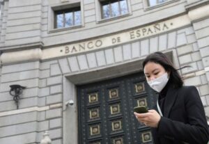 FILE PHOTO: Woman wears a protective face mask as she walks past Banco de Espana (Bank of Spain), amidst concerns over coronavirus outbreak, in Barcelona, Spain March 14, 2020. REUTERS/Nacho Doce
