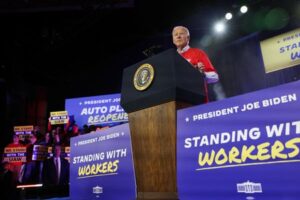 U.S. President Joe Biden delivers remarks to United Auto Workers (UAW) union members in Belvidere, Illinois, U.S., November 9, 2023. REUTERS/Leah Millis