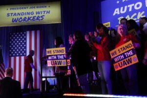 U.S. President Joe Biden leaves the stage after delivering remarks to United Auto Workers (UAW) union members in Belvidere, Illinois, U.S., November 9, 2023. REUTERS/Leah Millis