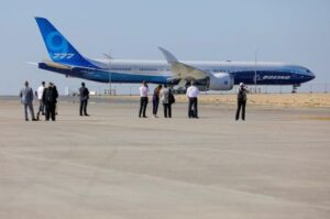 FILE PHOTO: FILE PHOTO: Visitors stand in front of the plane Boeing 777X during the Dubai Airshow, in Dubai, United Arab Emirates, November 14, 2021. REUTERS/Rula Rouhana/File Photo/File Photo