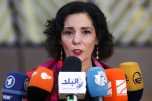 Belgium’s Foreign Minister Hadja Lahbib talks to the press as she arrives for a meeting of European Union foreign ministers in Brussels, Belgium February 19, 2024. REUTERS/Yves Herman