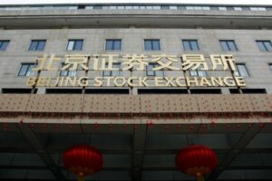The sign of Beijing Stock Exchange is seen at its entrance during an organised media tour, in Beijing, China February 17, 2022. REUTERS/Florence Lo/File Photo