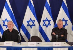 Israeli prime minister Benjamin Netanyahu and Cabinet minister Benny Gantz during a press conference in the Kirya military base in Tel Aviv , Israel , 28 October 2023. ABIR SULTAN POOL/Pool via REUTERS