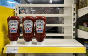 FILE PHOTO: Plastic bottles of Heinz tomato ketchup sit on a shelf in a Tesco store in London, Britain June 30, 2022. REUTERS/Simon Newman