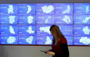 A woman stands next to an information electronic screen at the headquarters of Russia’s Central Election Commission during the presidential election in Moscow, Russia March 15, 2024. REUTERS/Evgenia Novozhenina