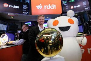 FILE PHOTO: CEO of Reddit Steve Huffman stands next to Snoo, the mascot of Reddit, at the New York Stock Exchange (NYSE) in New York City, U.S., March 21, 2024. REUTERS/Brendan McDermid/File Photo
