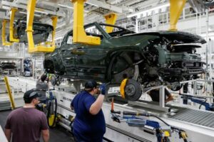 FILE PHOTO: Employees works on an assembly line at startup Rivian Automotive’s electric vehicle factory in Normal, Illinois, U.S. April 11, 2022. Picture taken April 11, 2022. REUTERS/Kamil Krzaczynski/File Photo