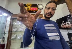 A vendor shows a silver necklace as he waits for customers in his silver shop, as gold prices recorded an increase after a devaluation of the local currency, in Cairo, Egypt February 7, 2024. REUTERS/Amr Abdallah Dalsh