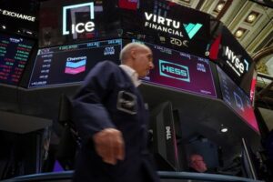 FILE PHOTO: Traders work on the floor as screens display the logo for Chevron Corp. and Hess Corp. at the New York Stock Exchange (NYSE) in New York City, U.S., October 23, 2023. REUTERS/Brendan McDermid/File Photo
