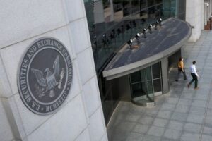 FILE PHOTO: People exit the headquarters of the U.S. Securities and Exchange Commission (SEC) in Washington, D.C., U.S., May 12, 2021. Picture taken May 12, 2021. REUTERS/Andrew Kelly/File Photo