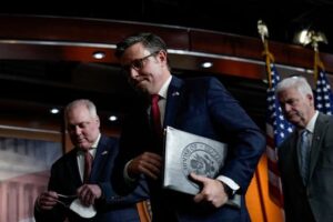 U.S. House Speaker Mike Johnson (R-LA) leaves a press conference with U.S. Representatives Steve Scalise (R-LA) and Tom Emmer (R-MN) on Capitol Hill in Washington, U.S., November 14, 2023. REUTERS/Elizabeth Frantz