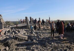 Palestinians inspect the site of an Israeli strike, amid the ongoing conflict between Israel and Palestinian Islamist group Hamas, in Rafah in the southern Gaza Strip, January 7, 2024. REUTERS/Arafat Barbakh