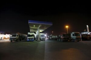 Trucks wait for fuel pumps to reopen after morning prayers, during early hours at a petrol station in Khobar, west of Riyadh, Saudi Arabia January 29, 2016. REUTERS/Hamad I Mohammed/Files
